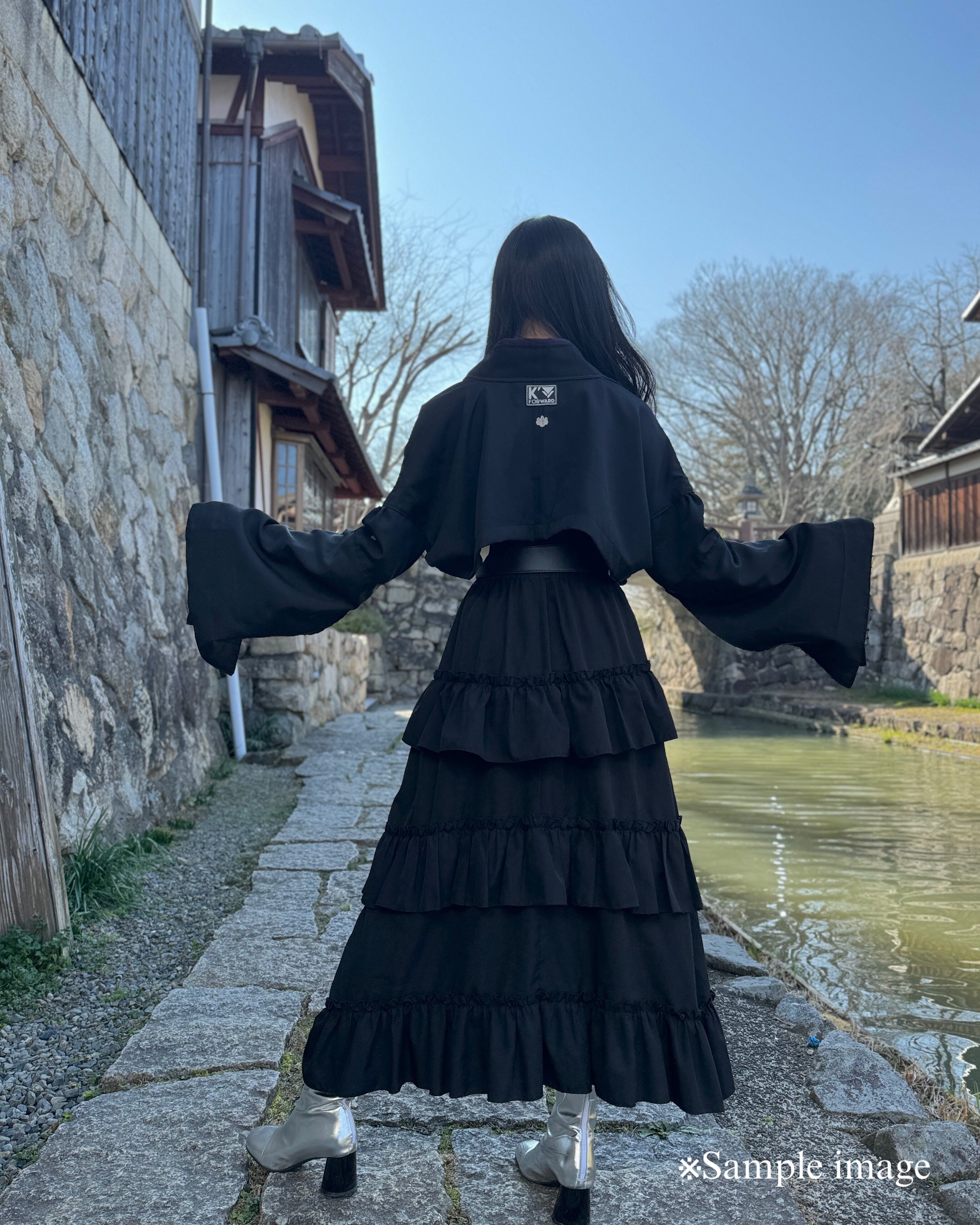 襟の内側には帯をあしらい、羽織った際にちらりと覗く和のディテールがアクセントになっています。