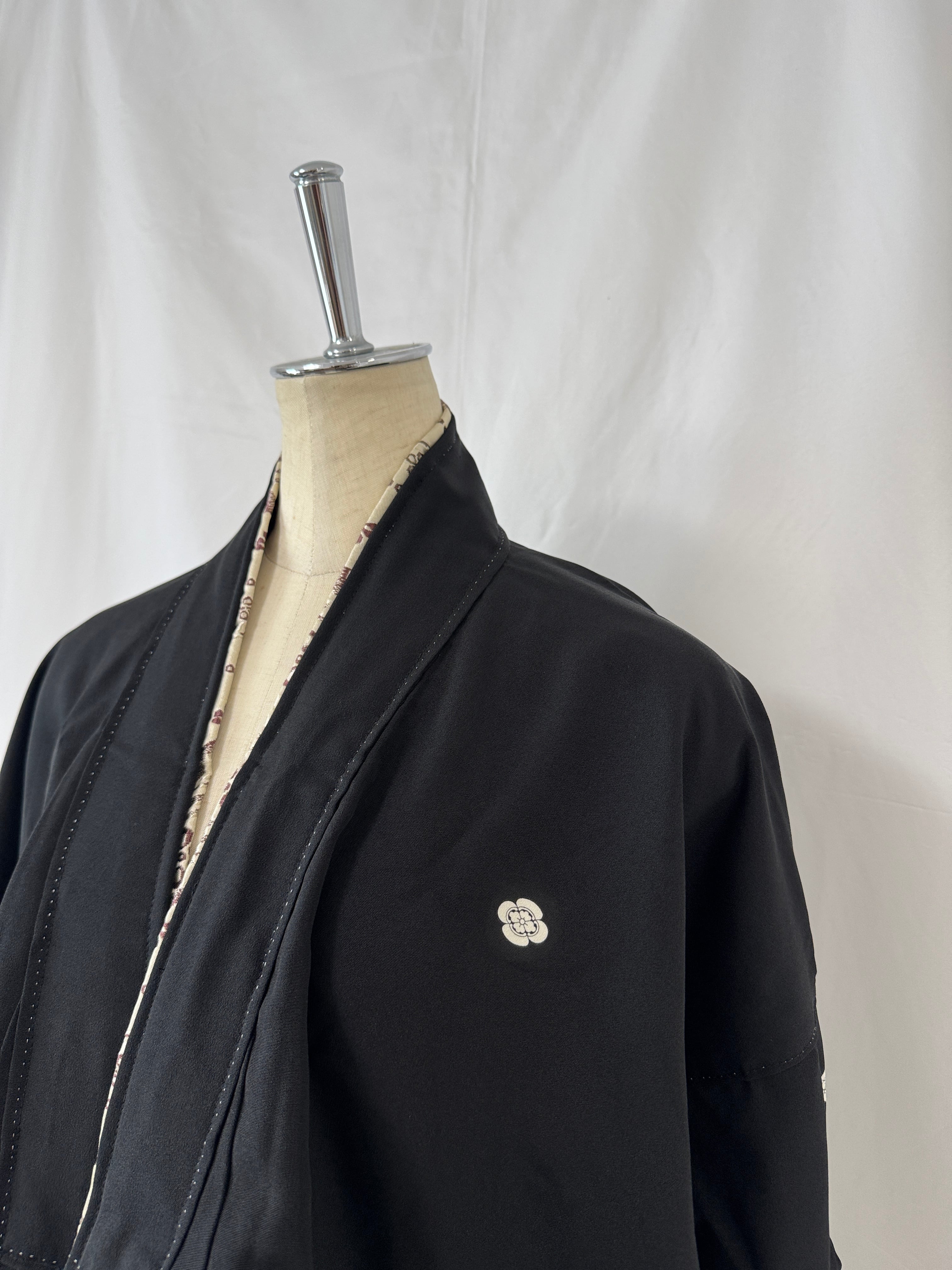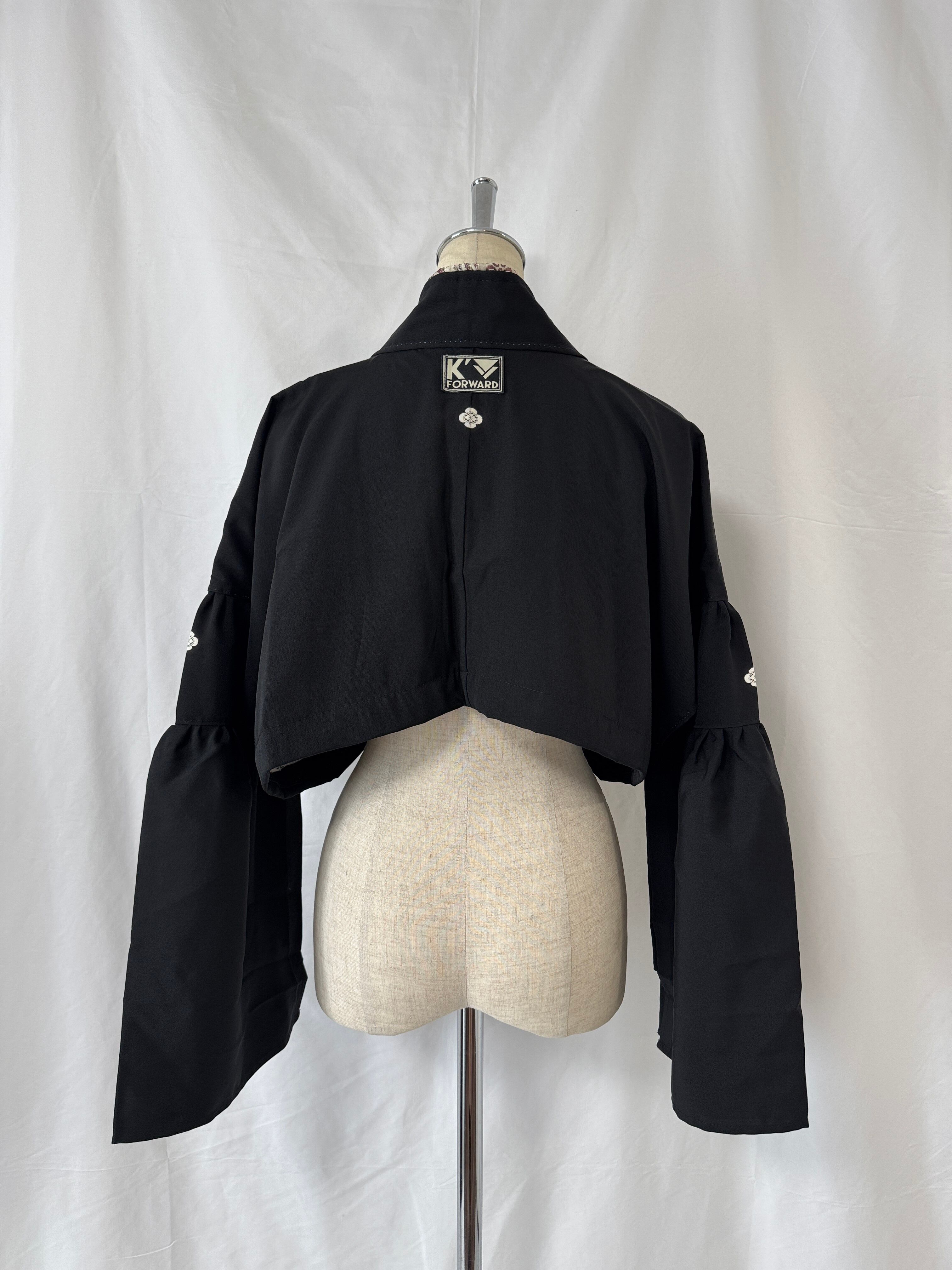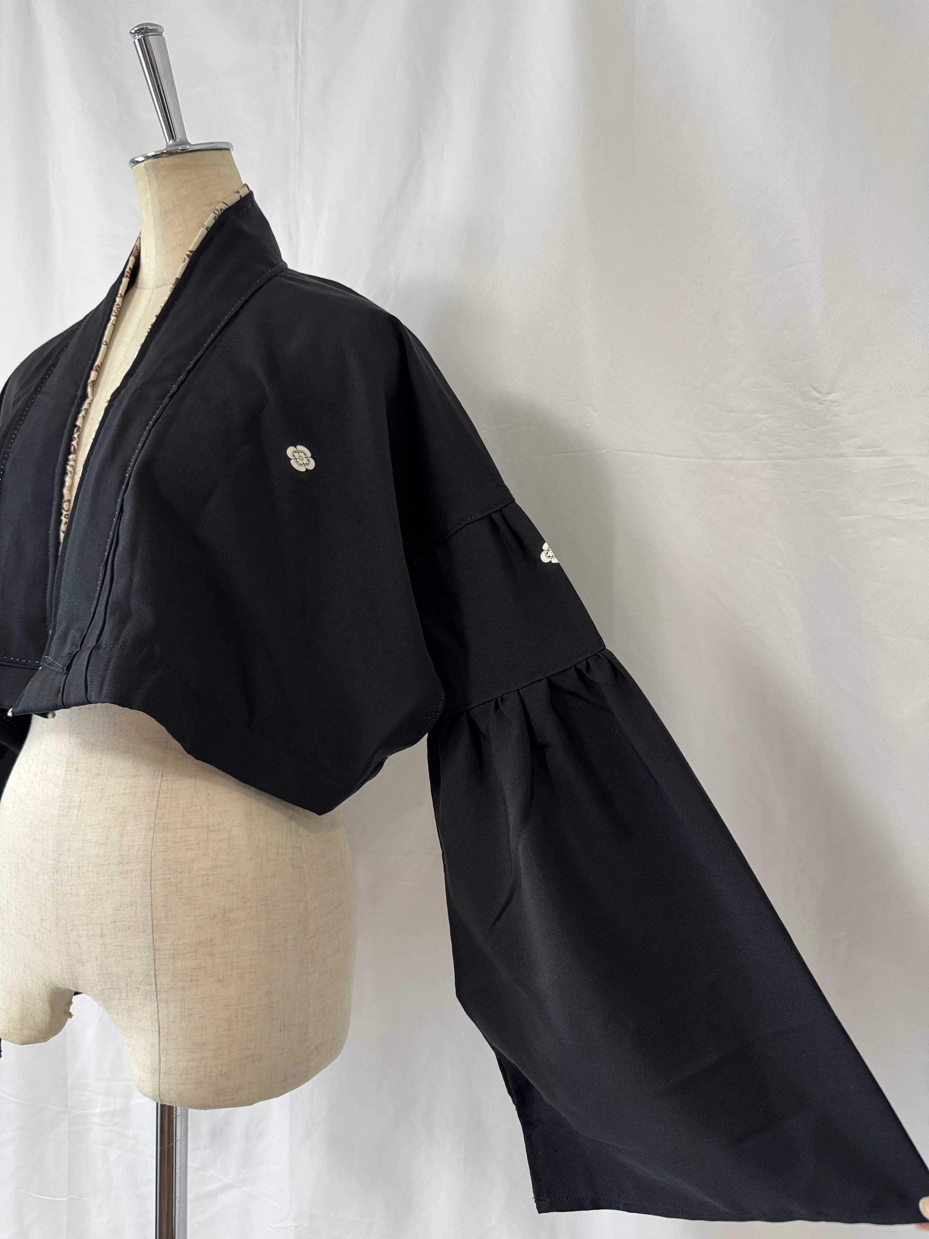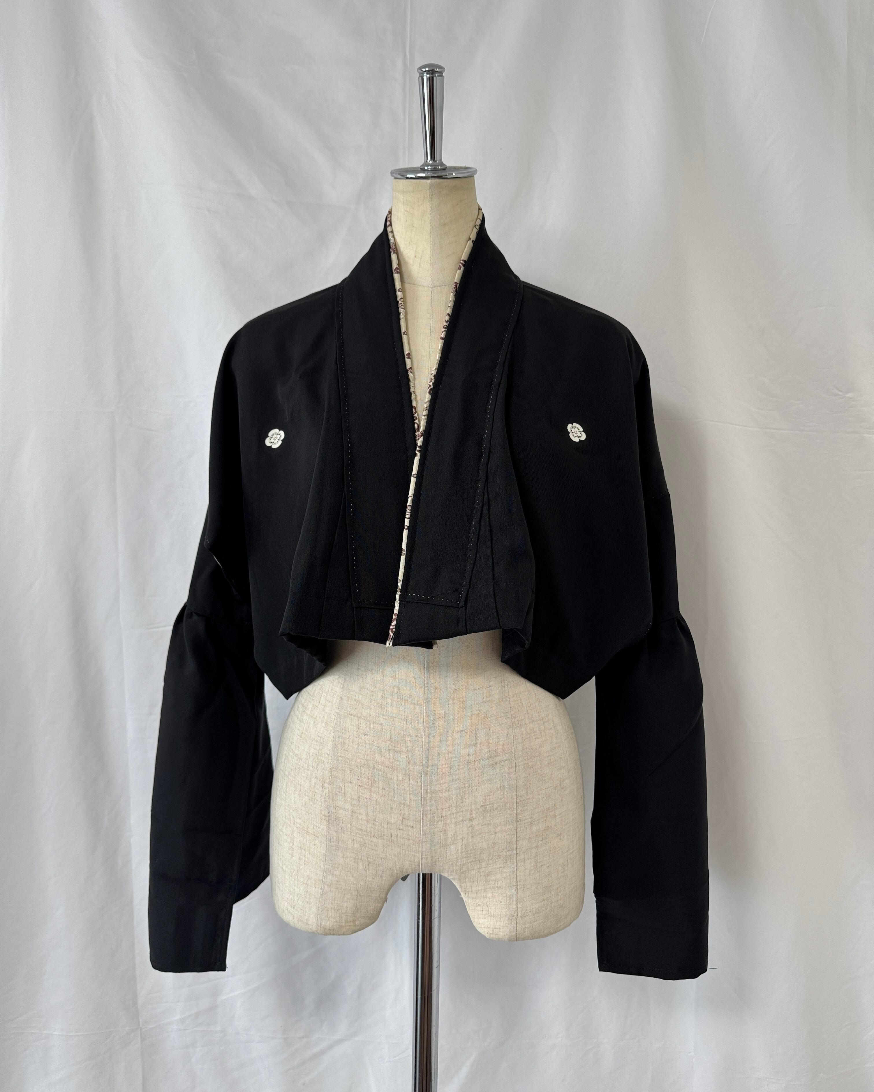 A stylish short jacket crafted from repurposed kimono fabric.