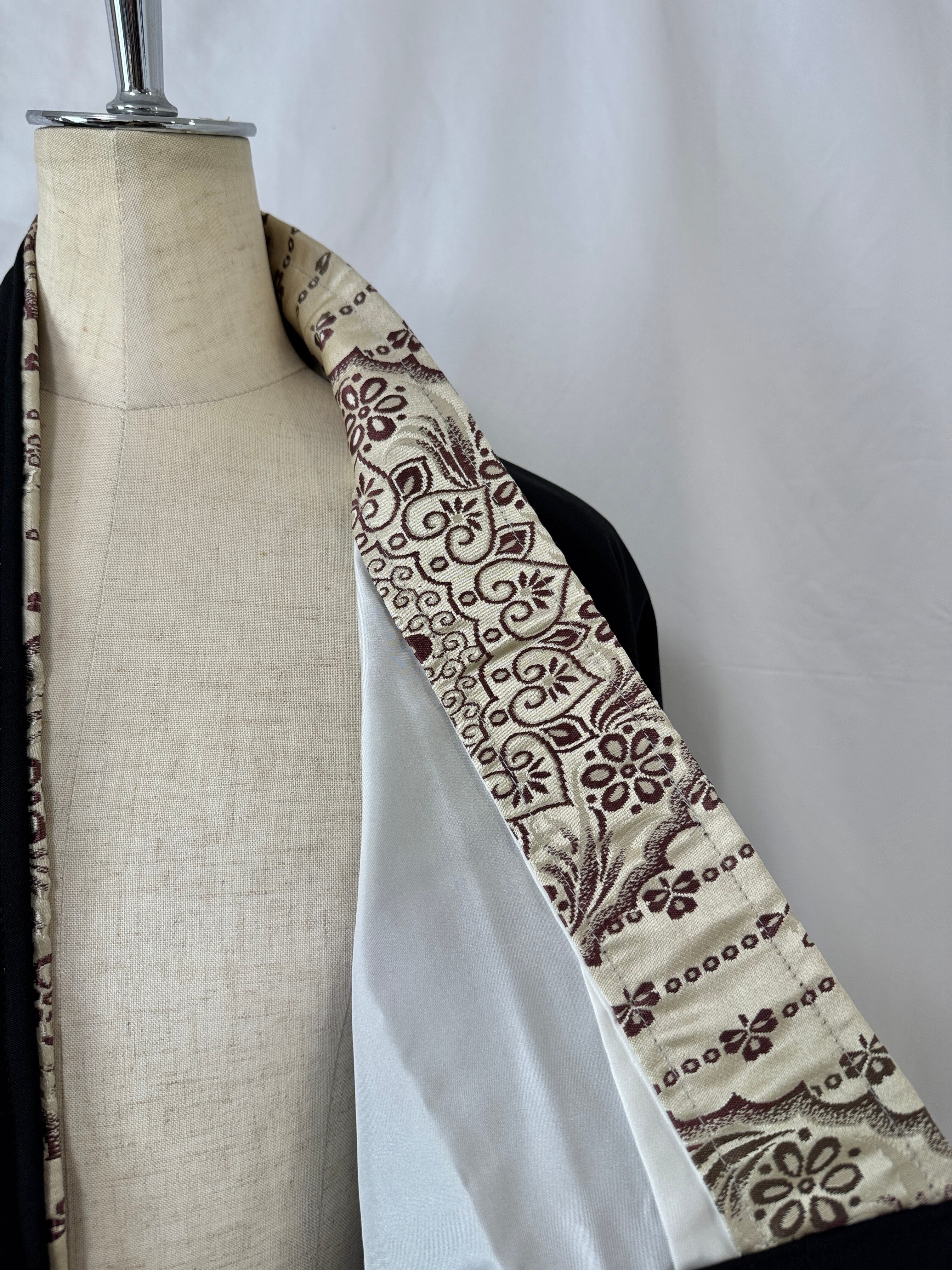 The collar is lined with an obi sash, creating a Japanese-inspired accent that peeks out when worn.
