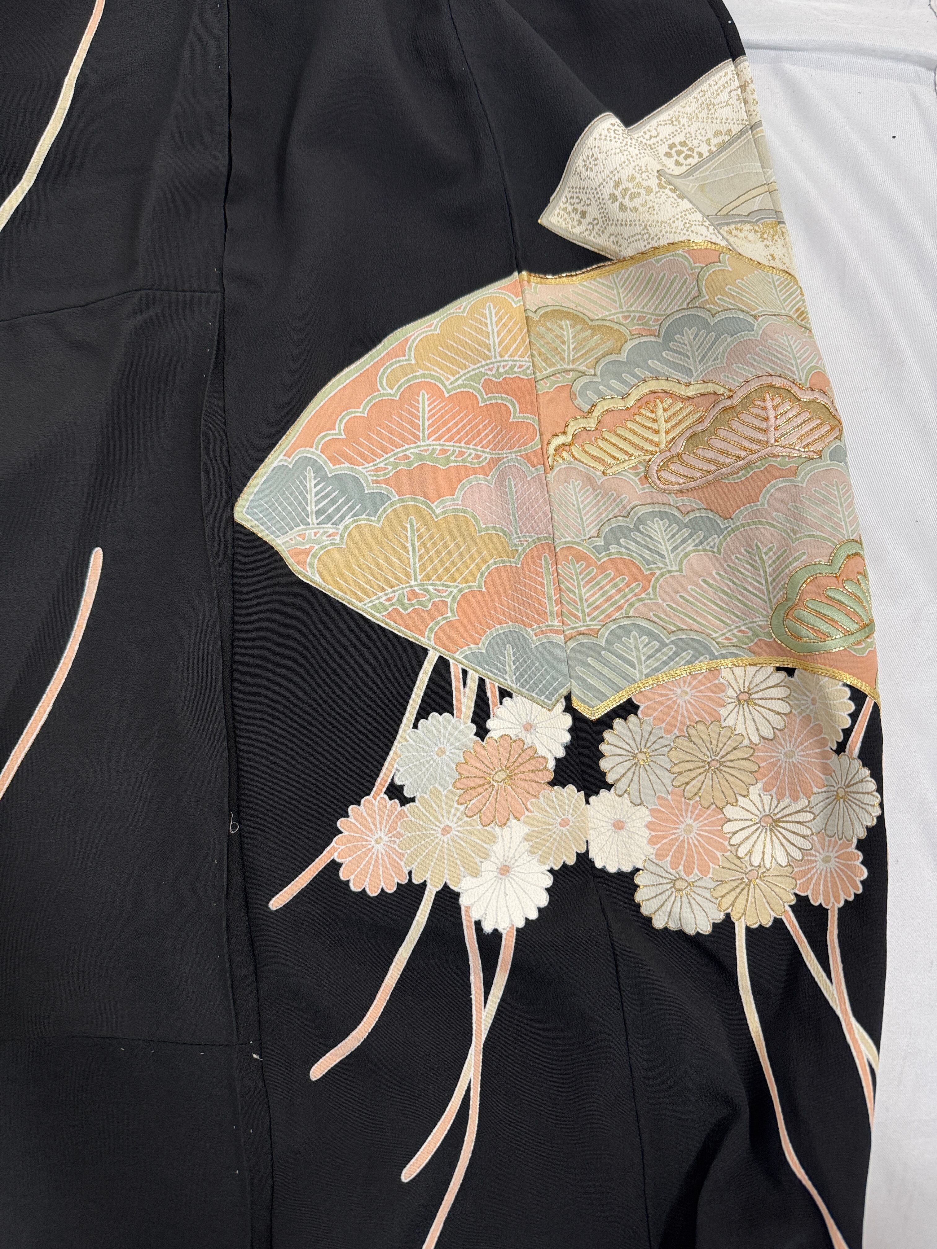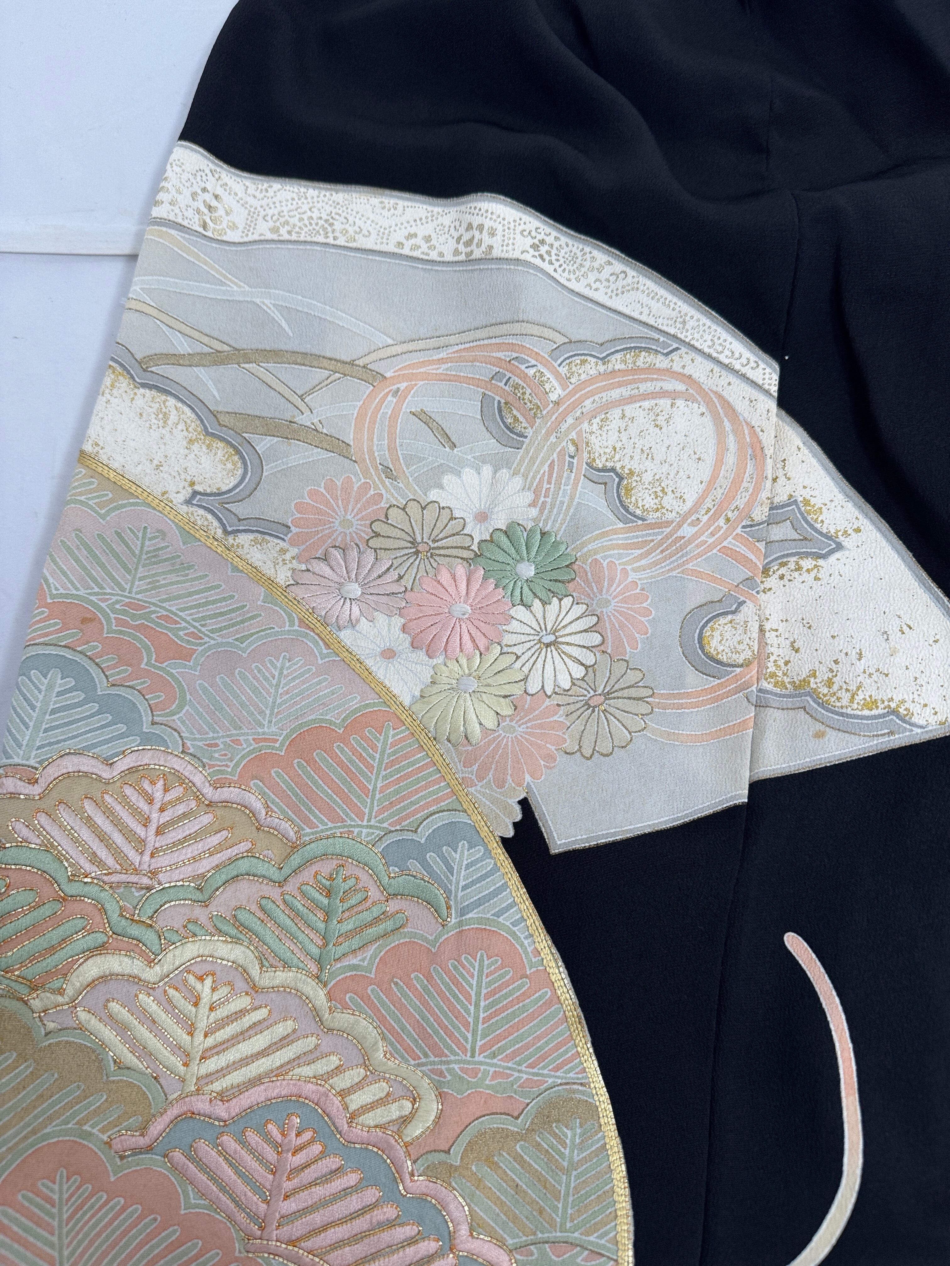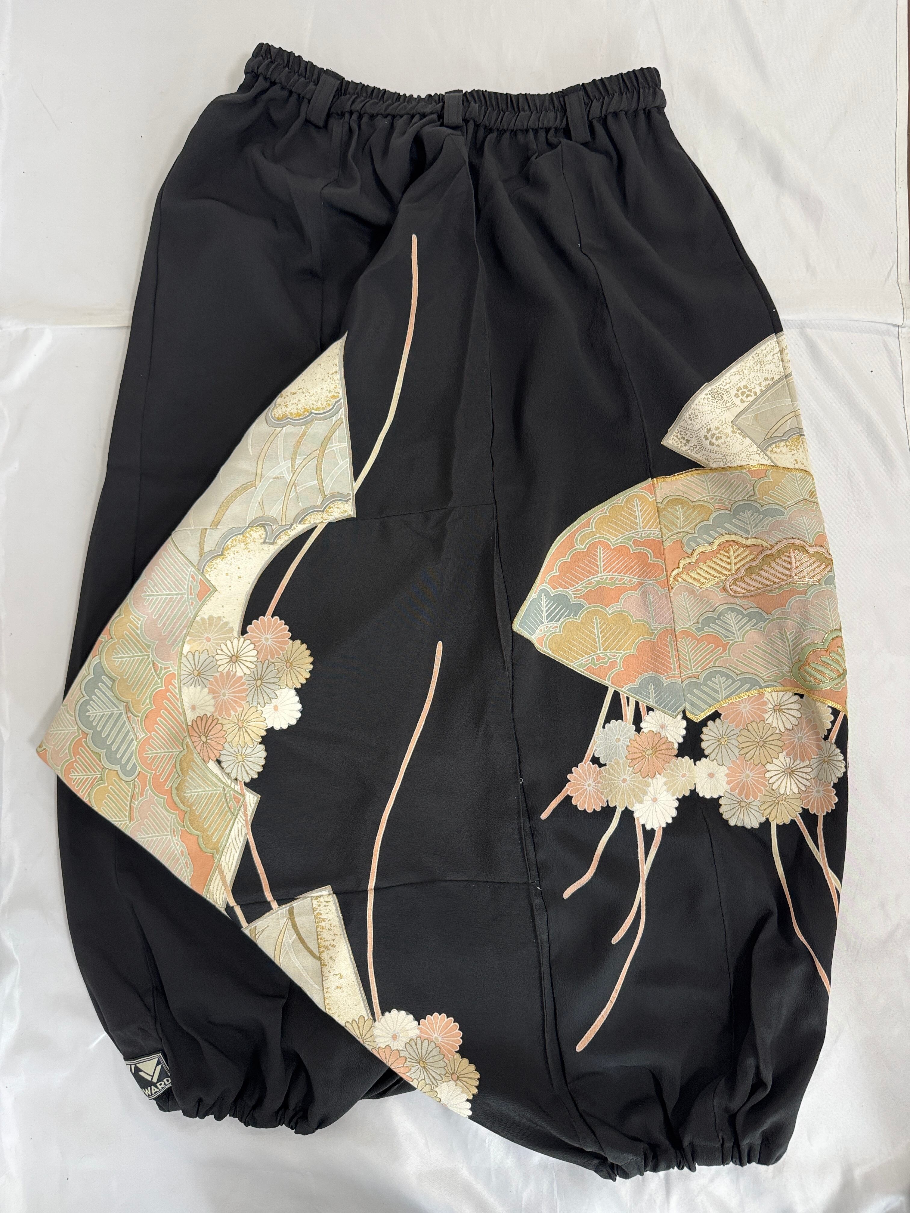 格式ある黒留袖を贅沢に使用し、ゆったりとしたサルエルシルエットのパンツにリメイク。