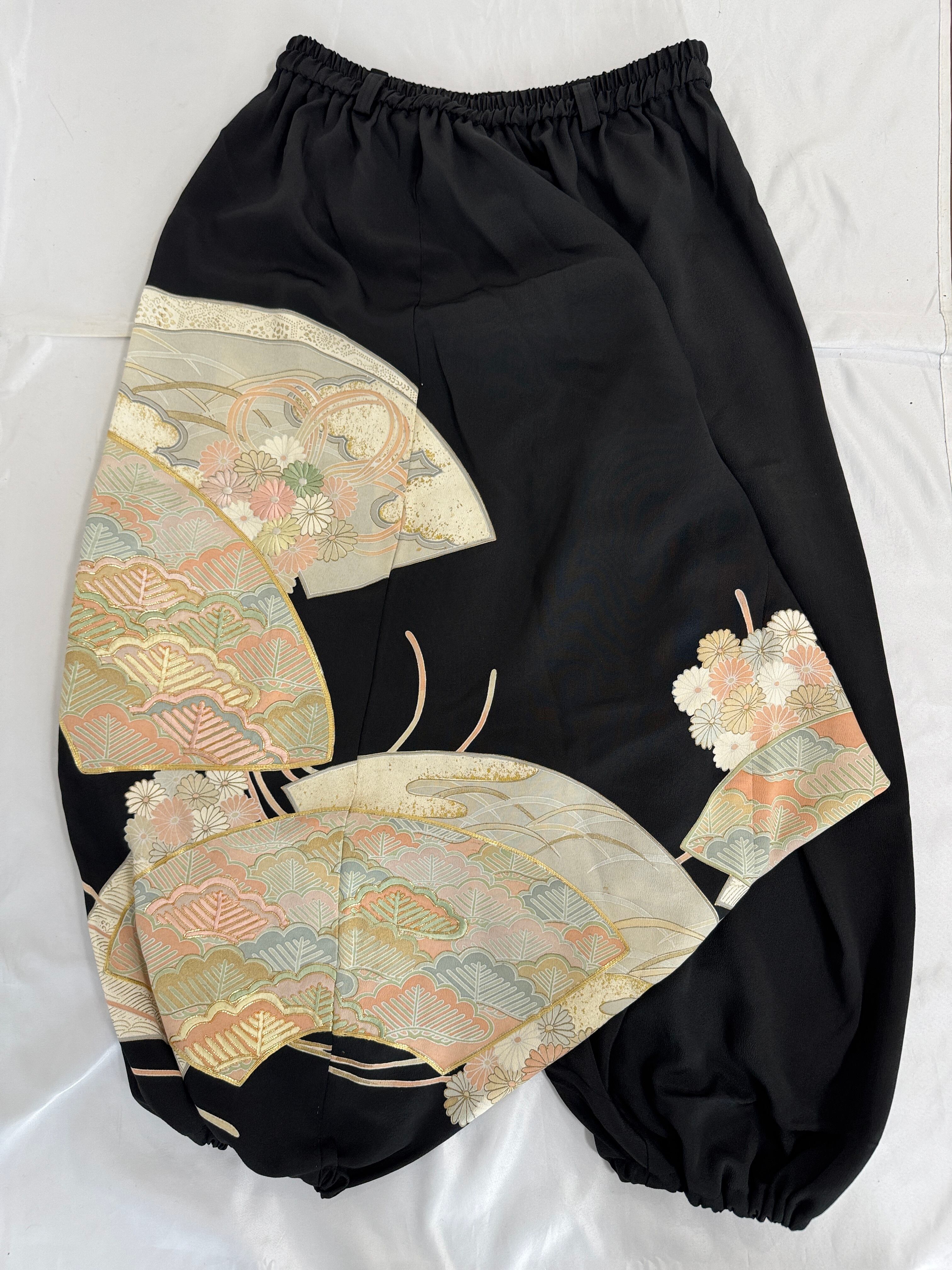 The prestigious tomesode is luxuriously used and upcycled into pants with a loose sarouel silhouette.