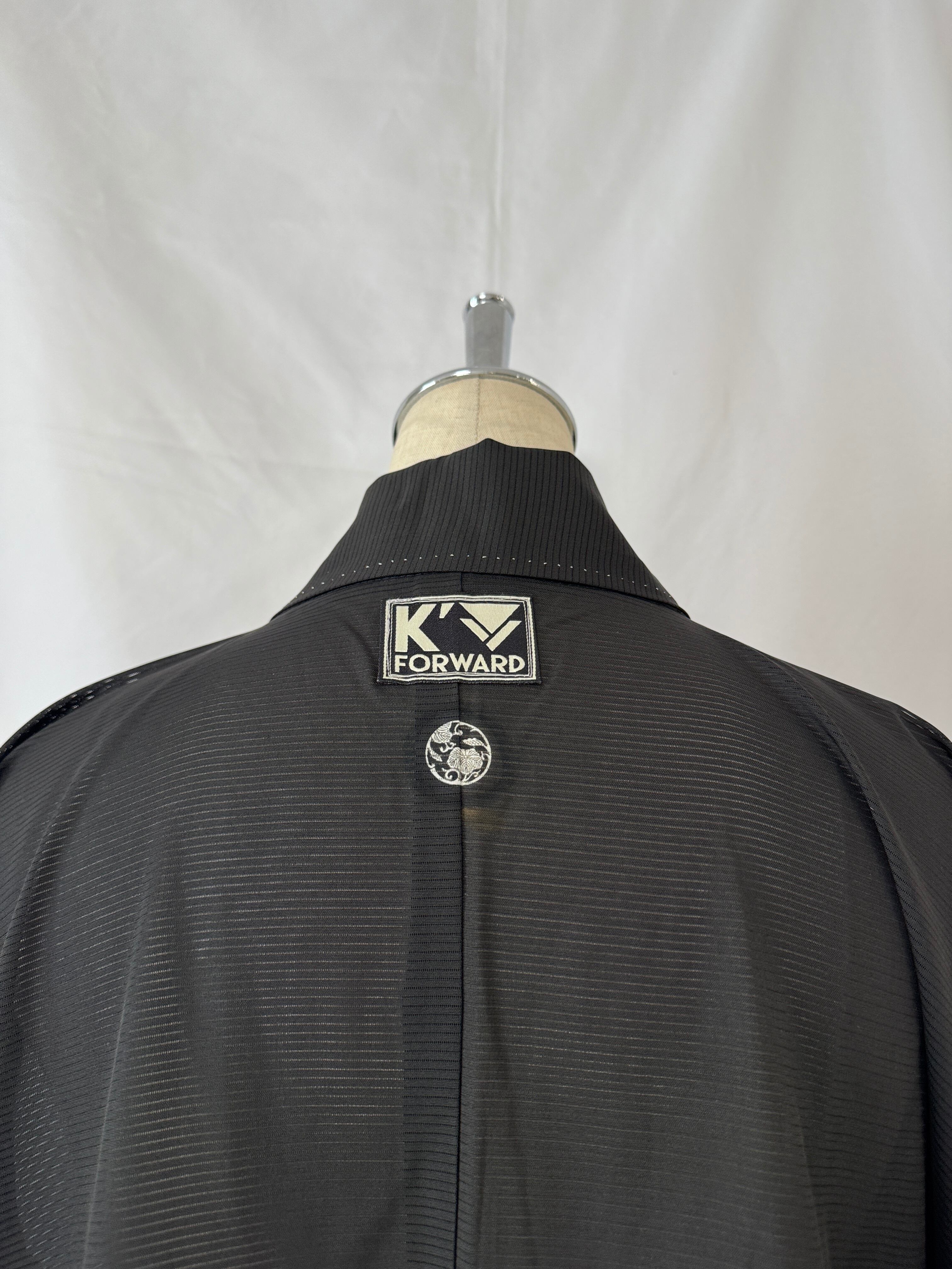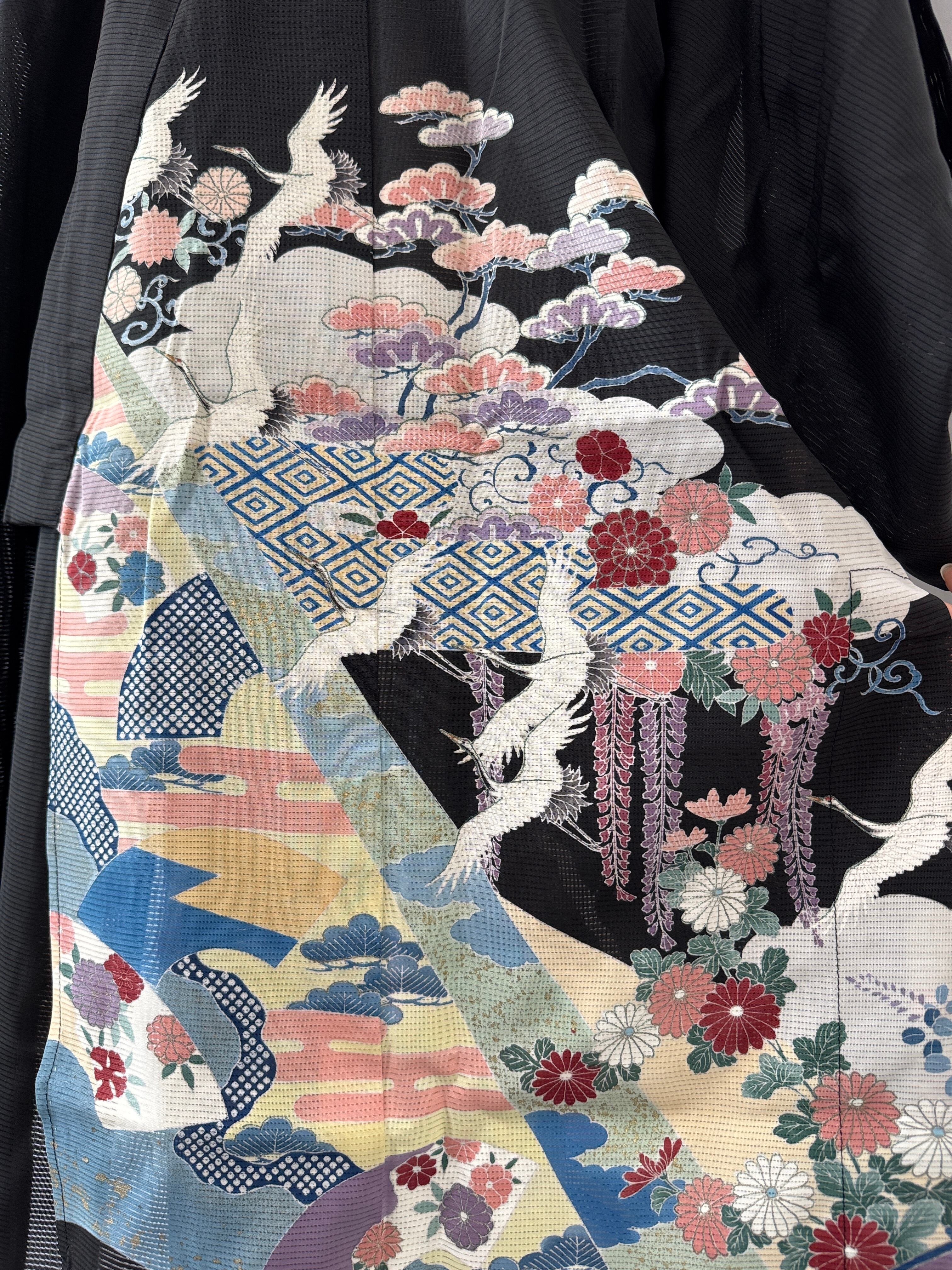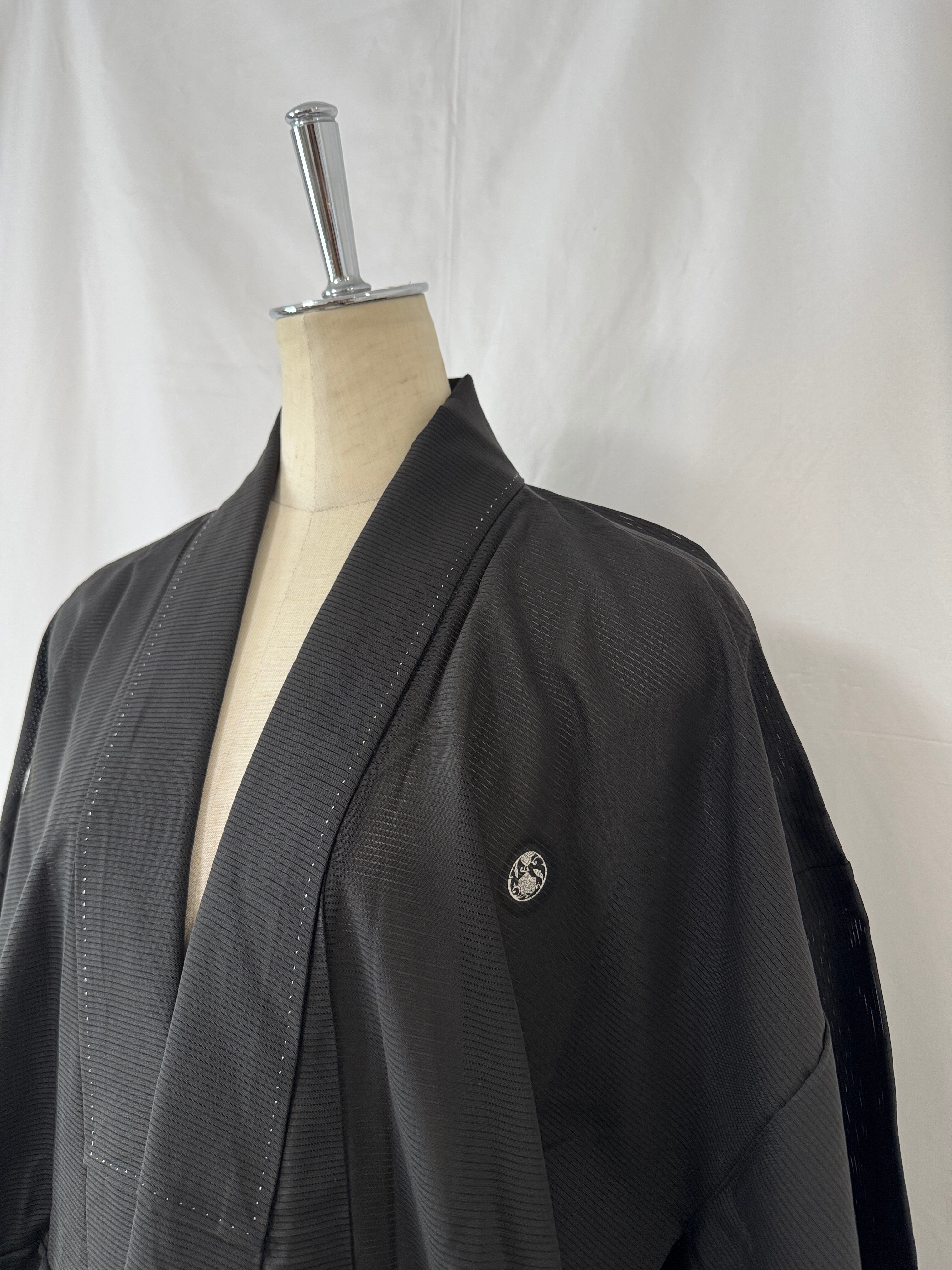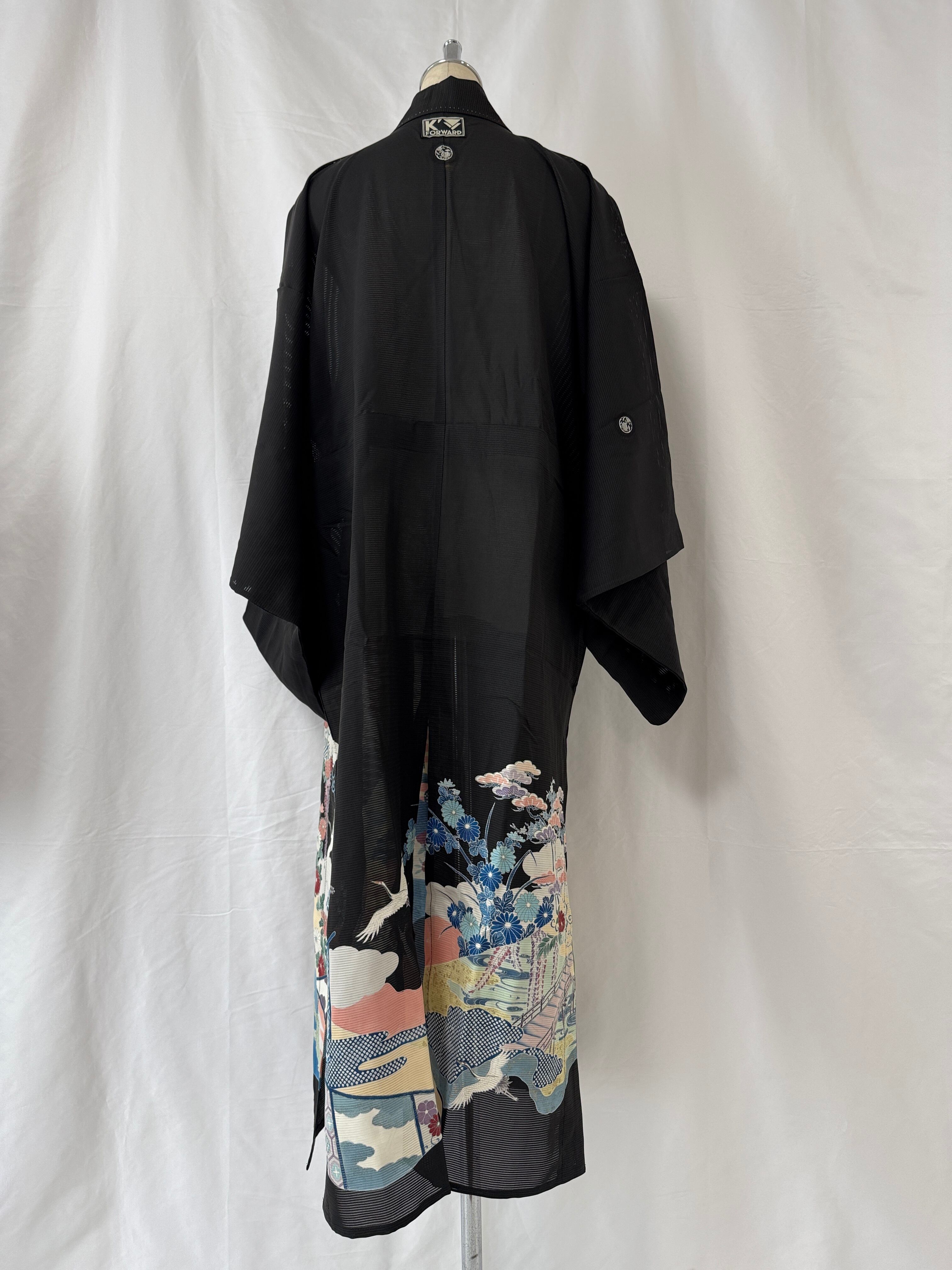 夏用の黒留袖を、軽やかなロングコートへと再構築した一点物のリメイク作品。