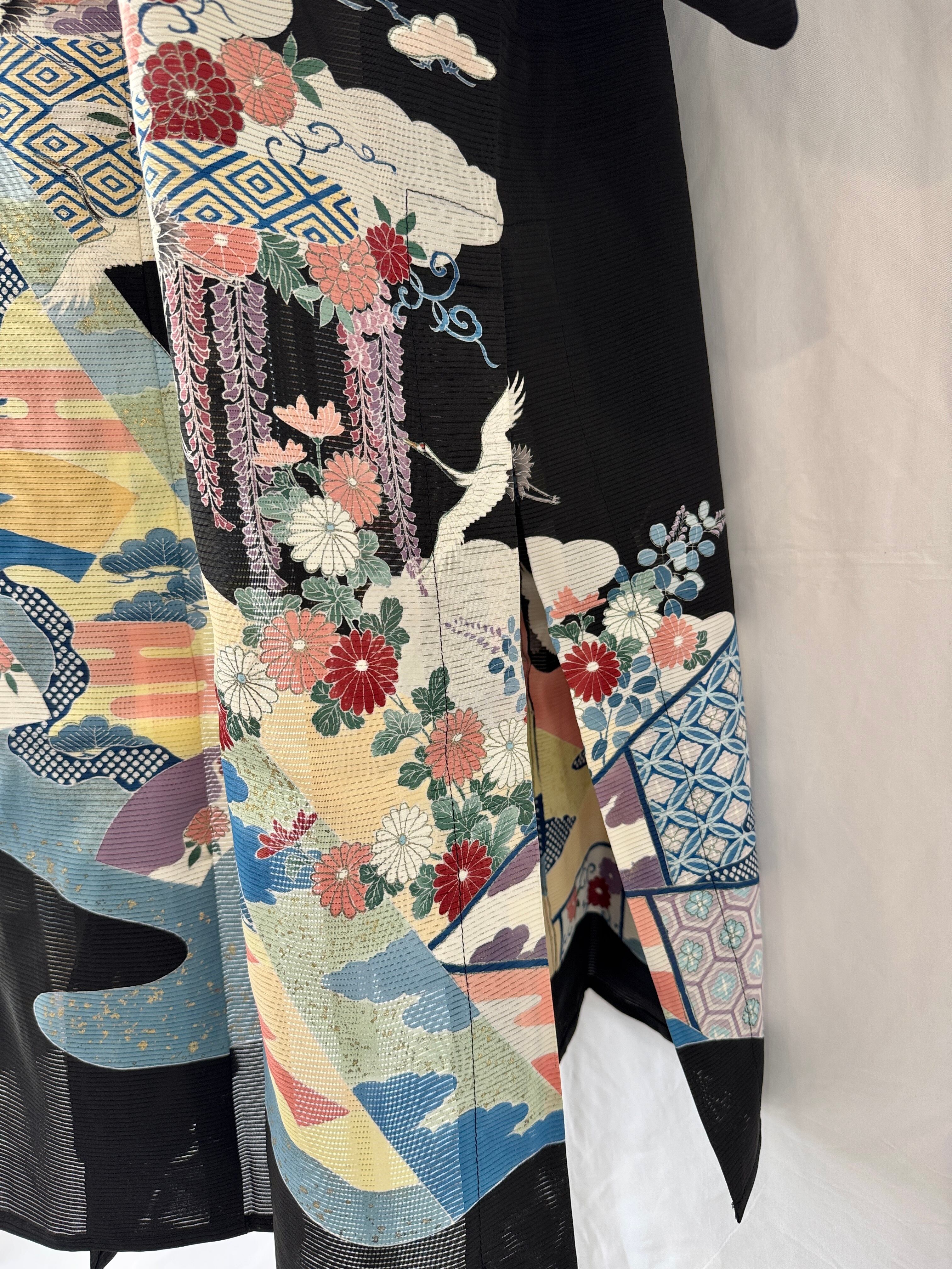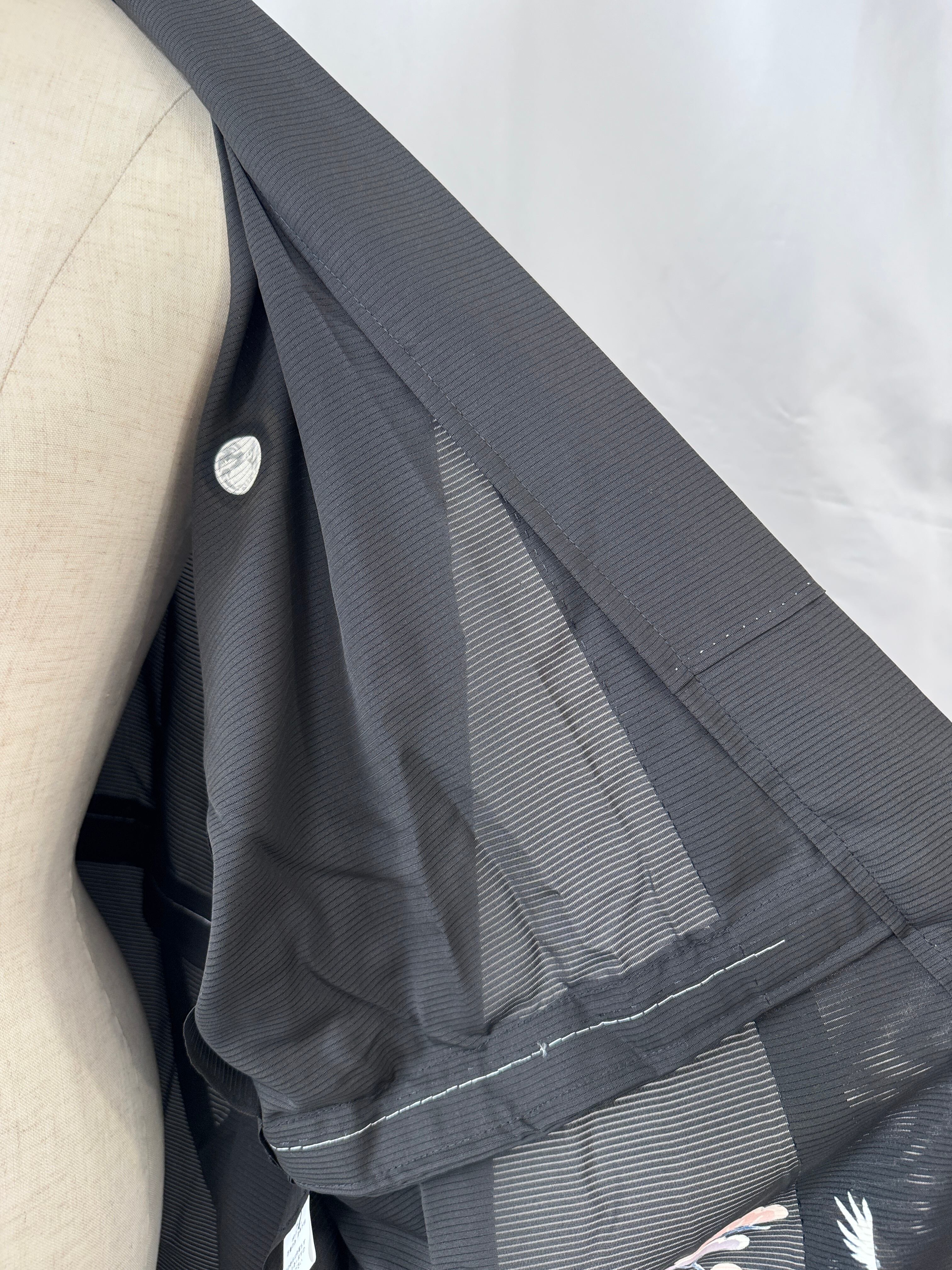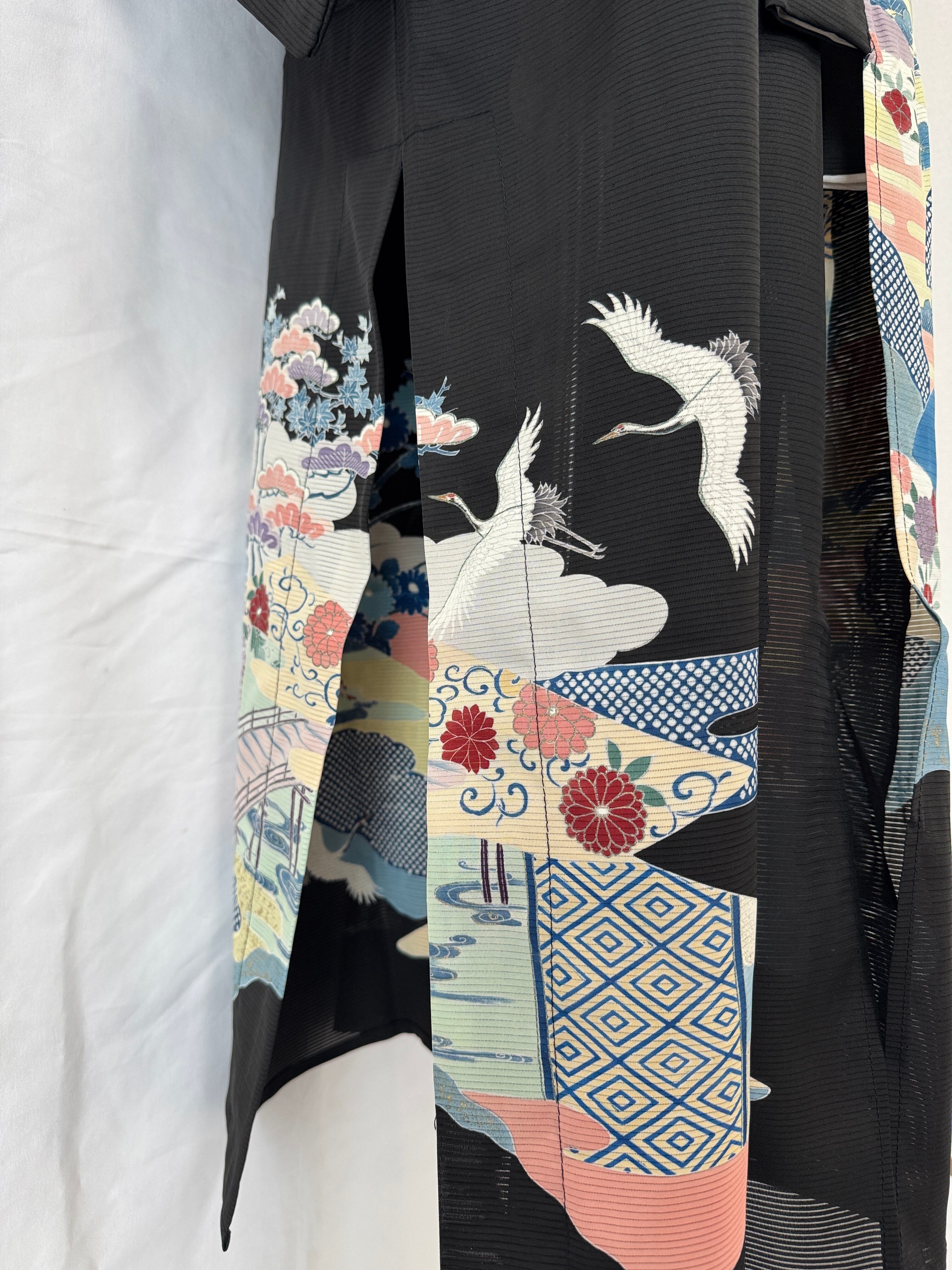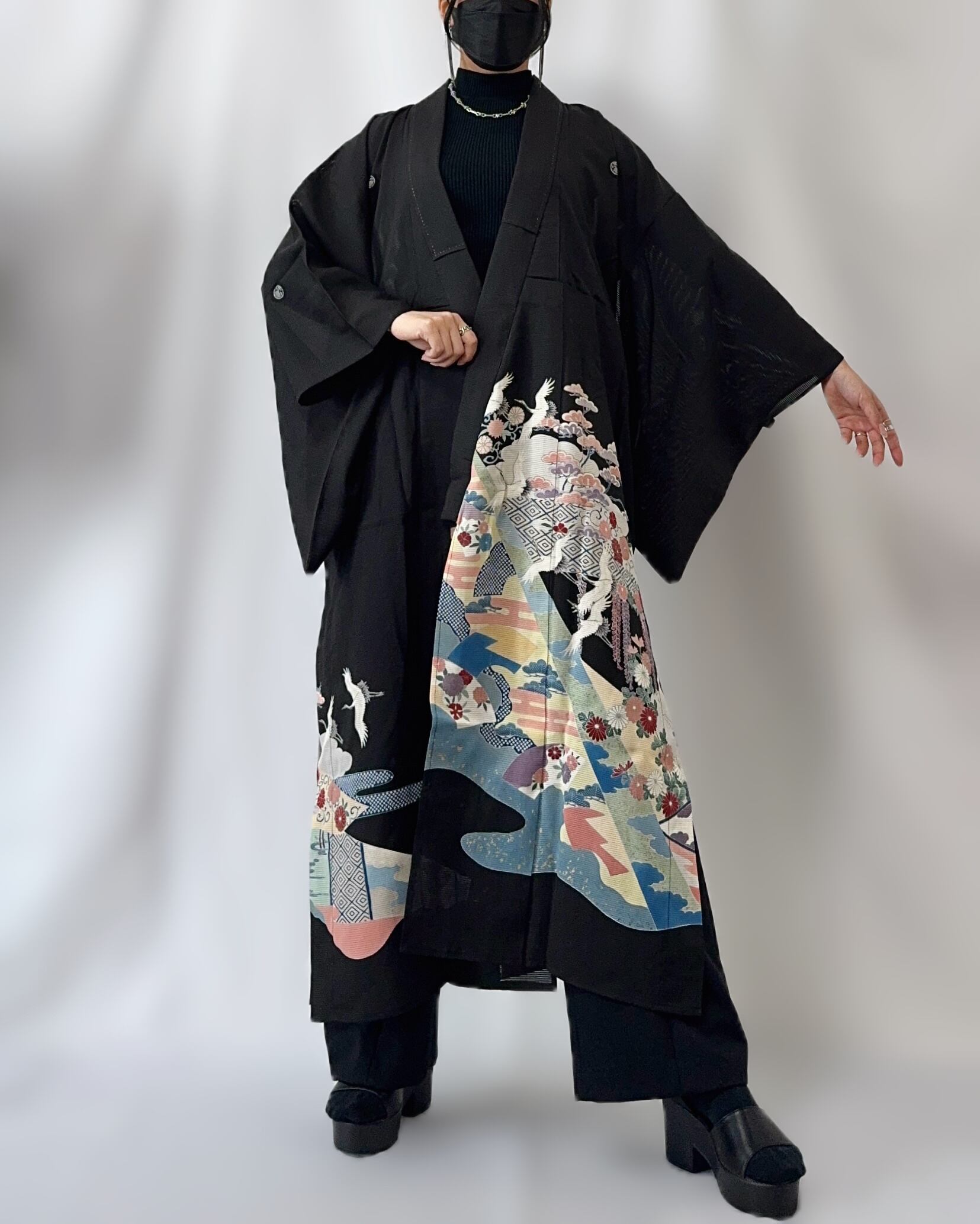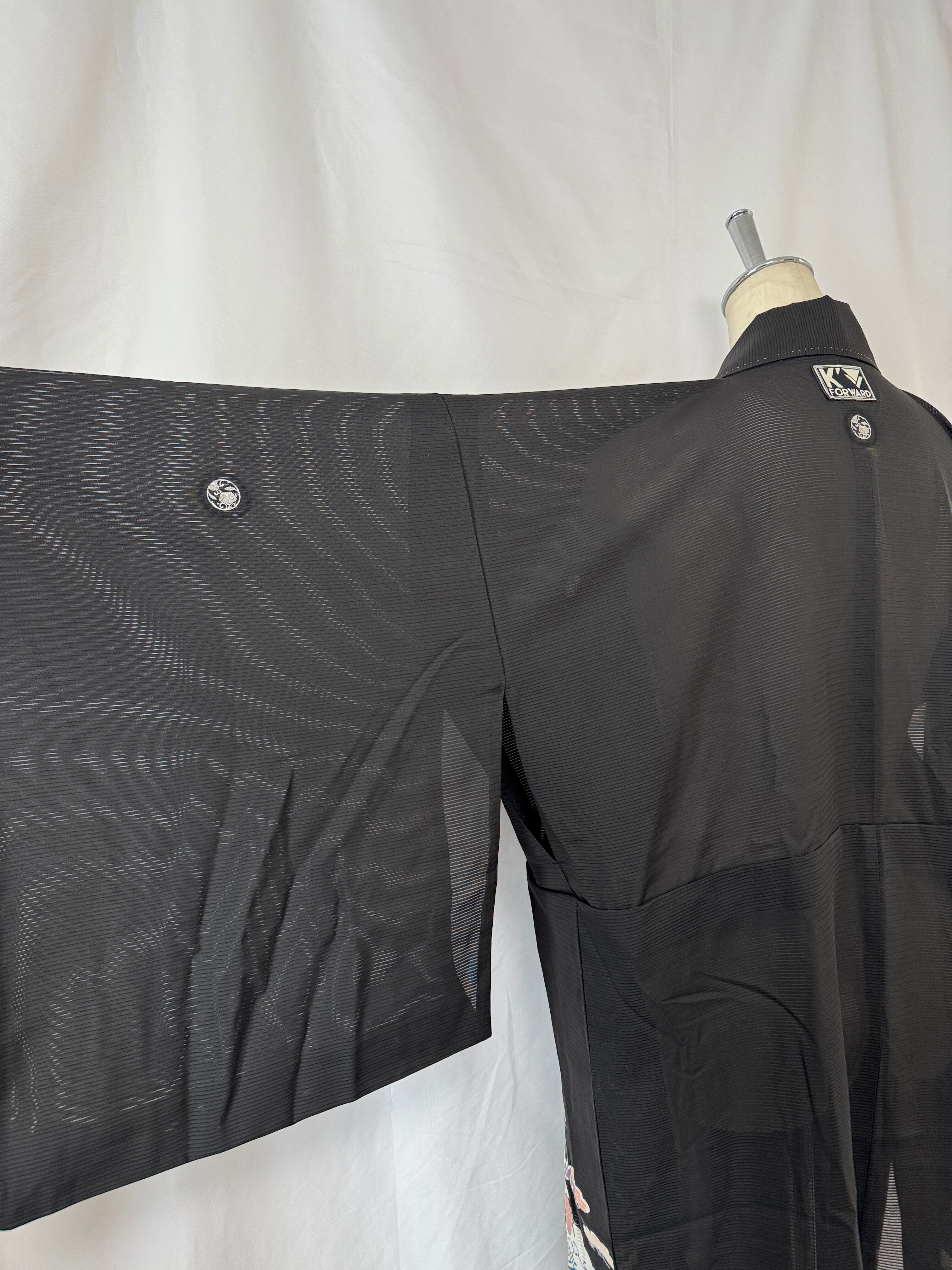 夏用の黒留袖を、軽やかなロングコートへと再構築した一点物のリメイク作品。