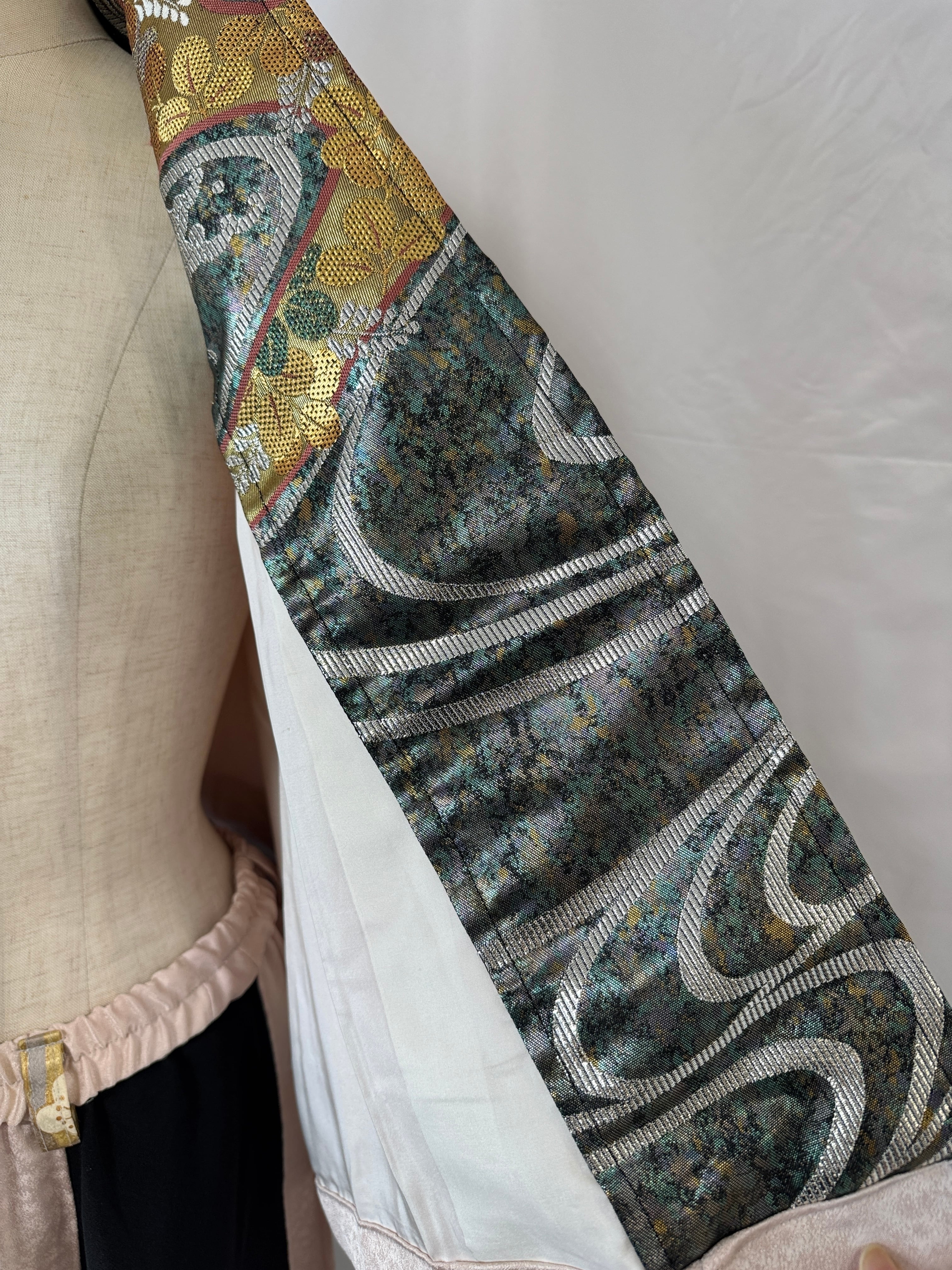ジャケットには、襟裏に帯をあしらっており、羽織ったときにちらりと見える帯柄が上品なアクセントに。