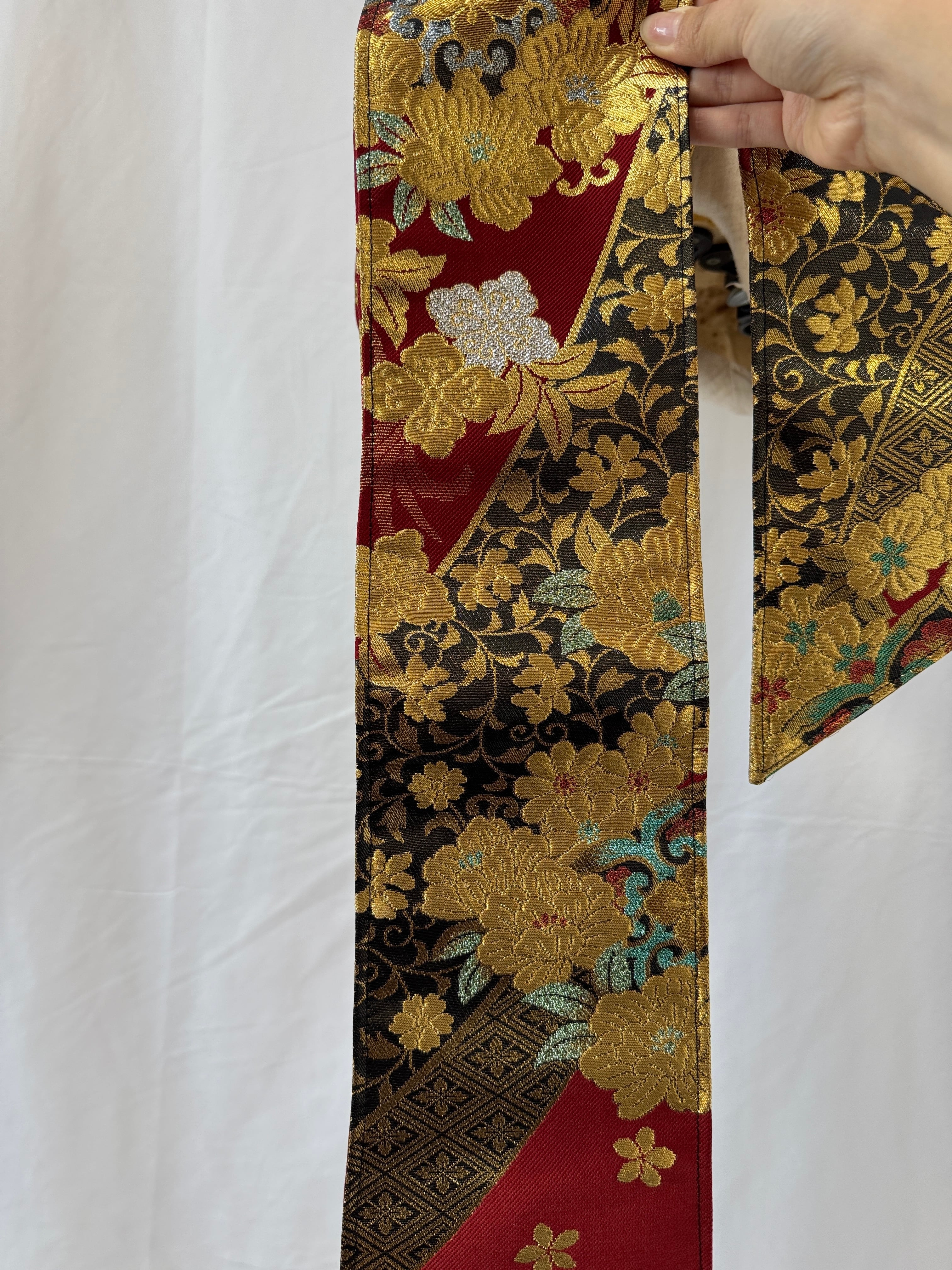 ヴィンテージの帯に新たな命を吹き込み、ショールとしてリメイクした特別な一点物。