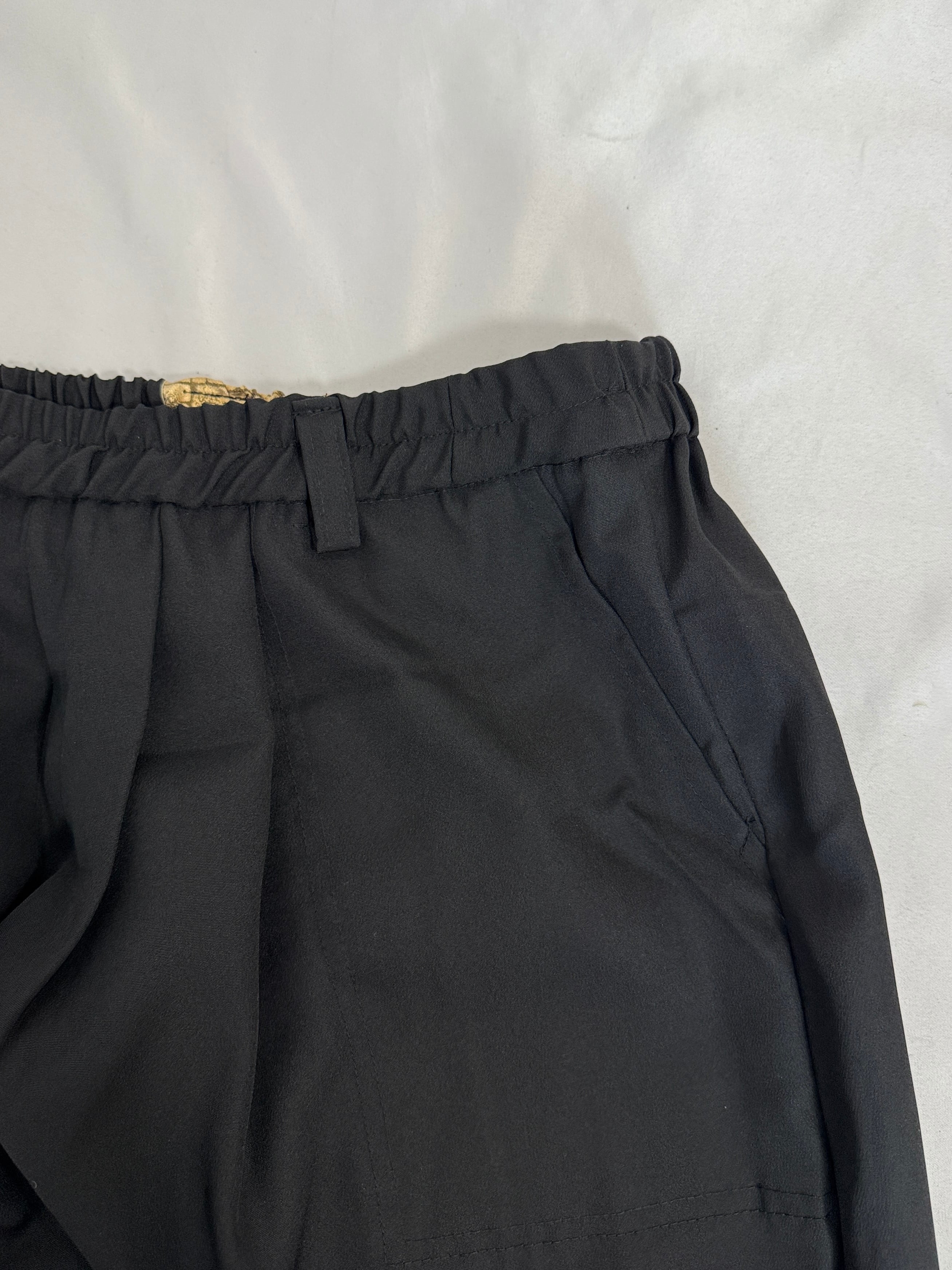 A one-of-a-kind piece crafted by luxuriously repurposing a traditional kurotomesode kimono into pants with a sophisticated silhouette.