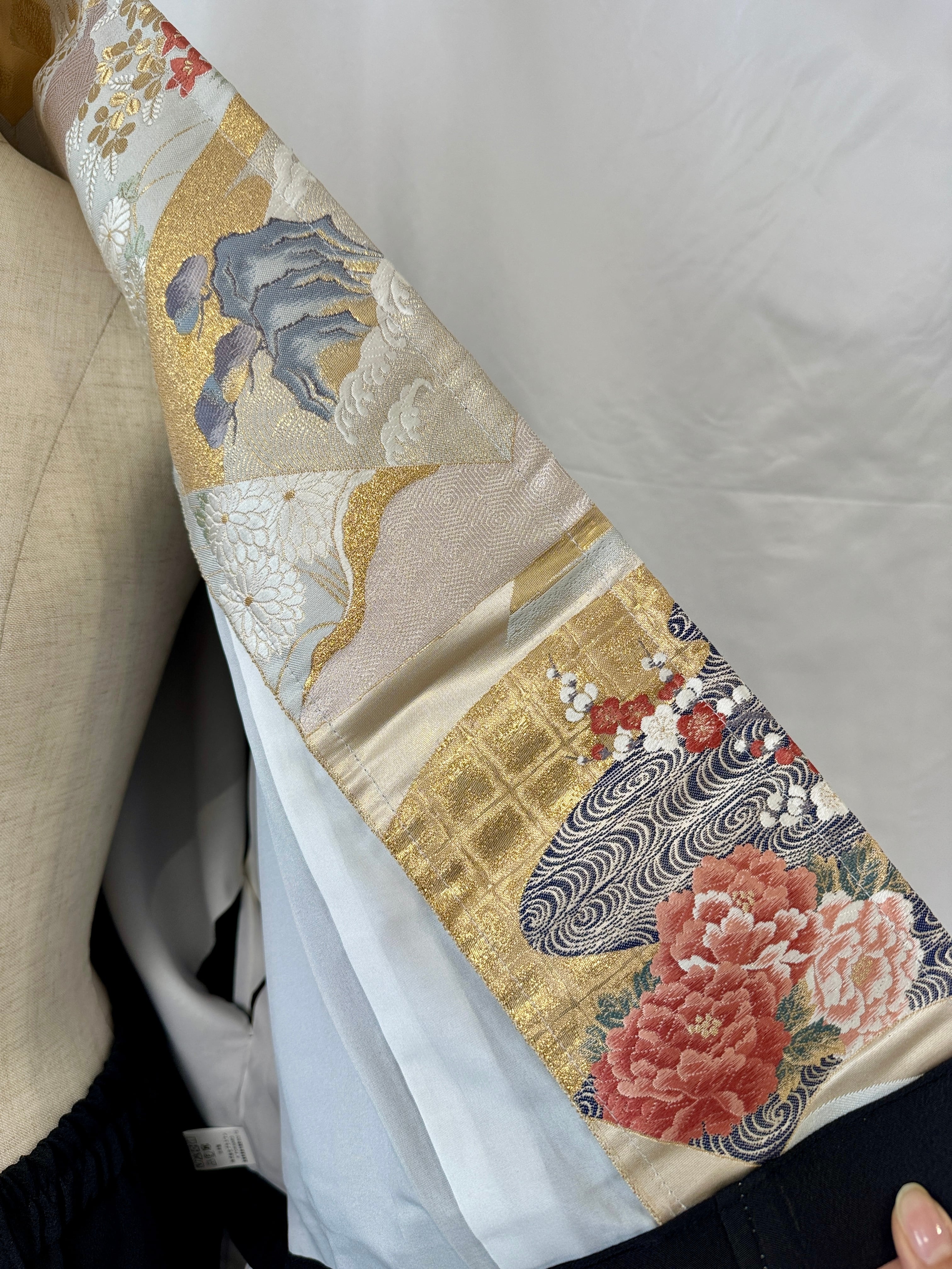 An obi matching the overall design is sewn onto the inside of the collar, creating a stylish accent when the jacket is worn.